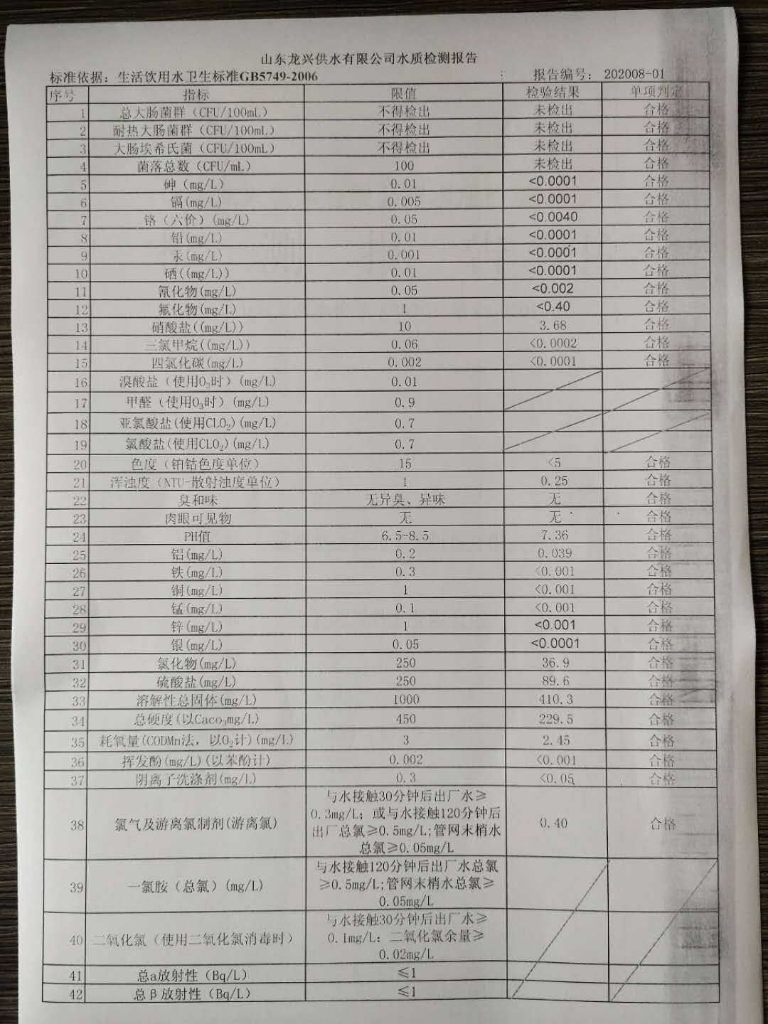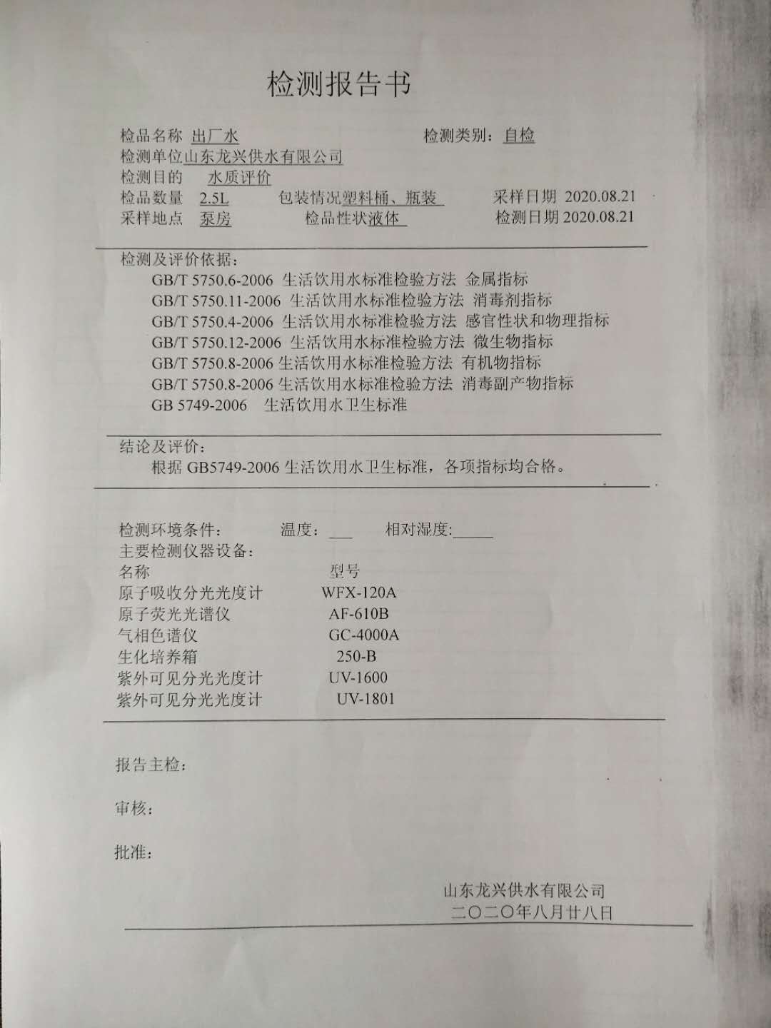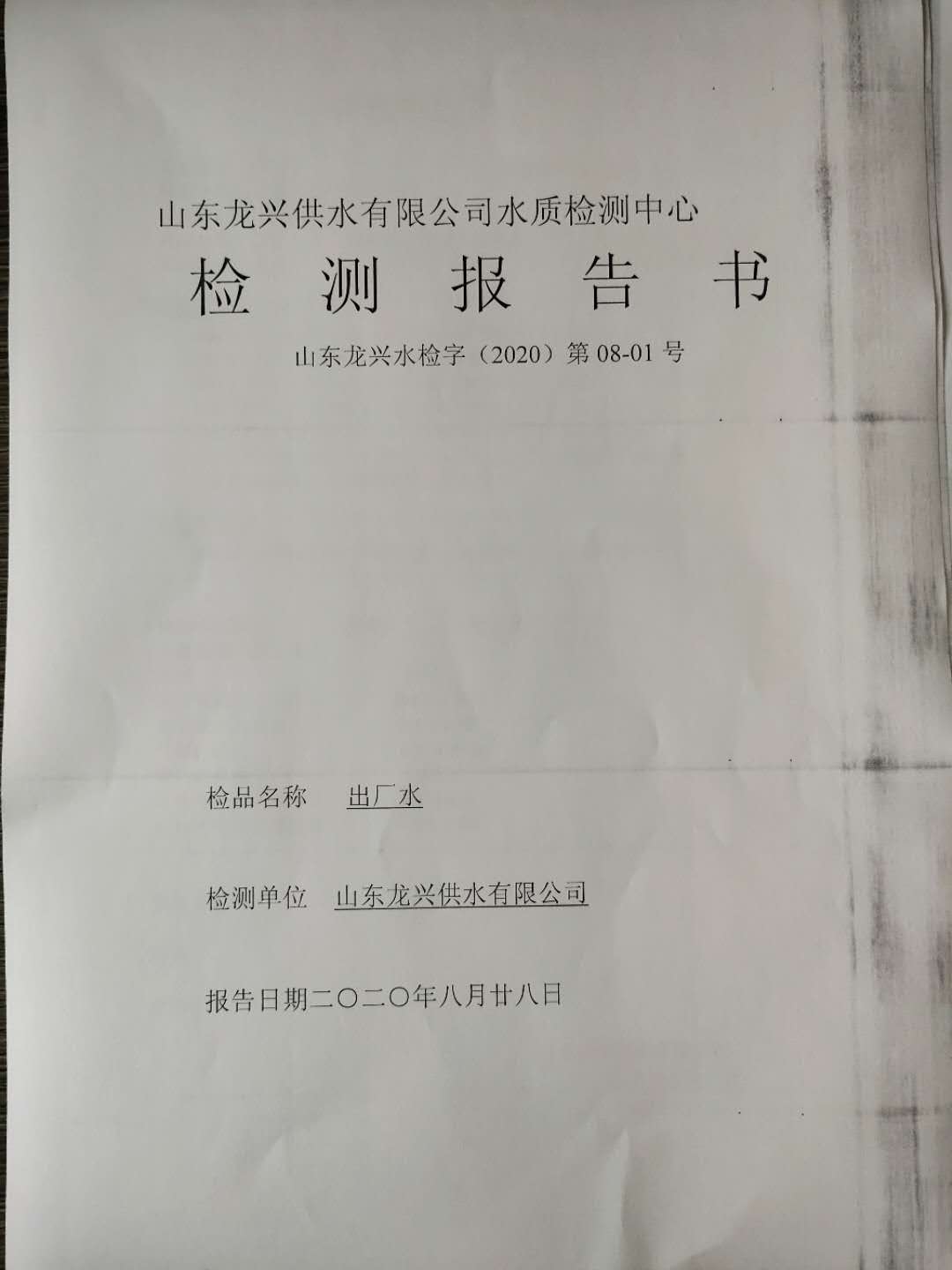 2020年8月出廠水月檢報(bào)告